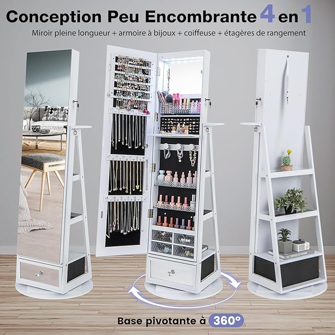 360° drejelig smykkearmoireskab med spejl i fuld længde, fritstående smykkespejl med LED og holder til hårtørrer